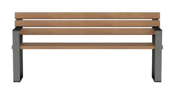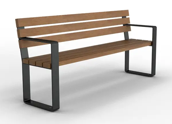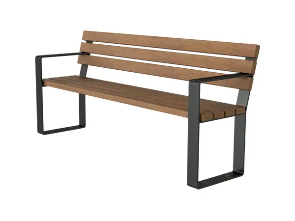 Banc avec dossier et accoudoirs sobre et intemporel. Assise en bois de Kambala (FSC certifié) résistant aux intempéries et stable. Structure en acier plat 80 x 10 mm, zingué à chaud et revêtu DB 703.