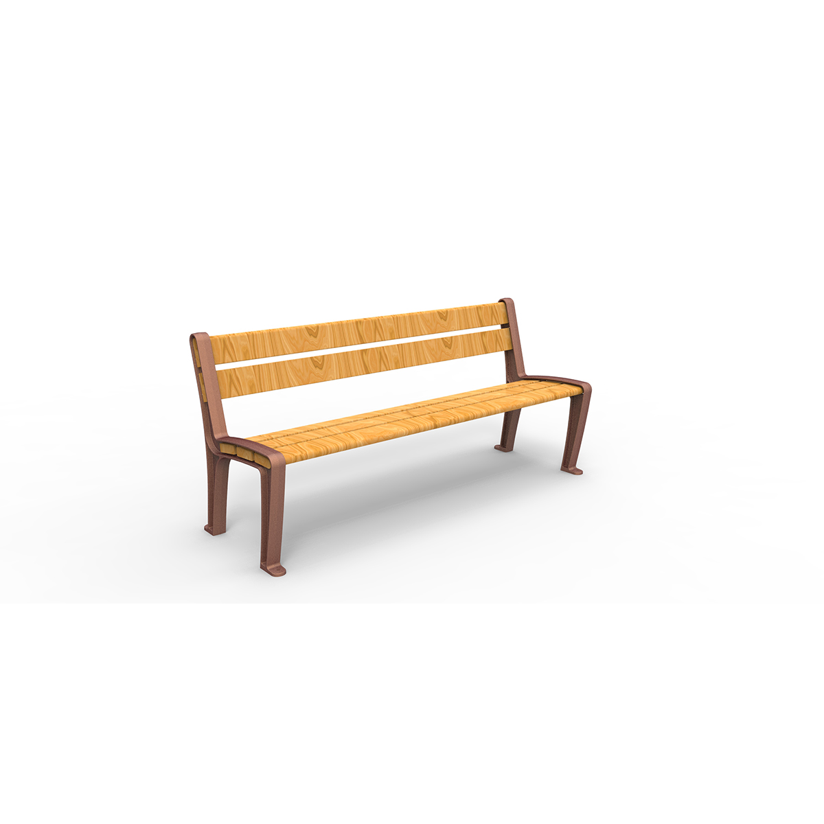 Banc composé de deux côtés symétriques en fonte d’acier peinte, moulés de manière à accueillir 5 lames de bois traité pour l’extérieur qui forment l’assise et le dossier. Le banc est prévu pour être fixé au sol à l’aide de chevilles.